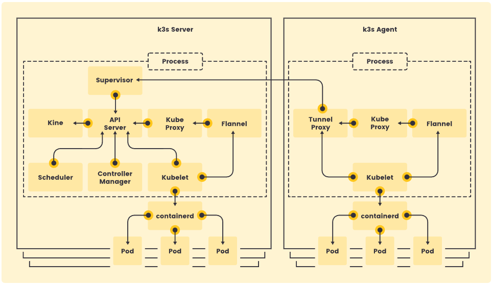 K3s 在架構上與原生 Kubernetes 有幾個顯著的不同點,這些差異是其輕量化和易用性的關鍵: